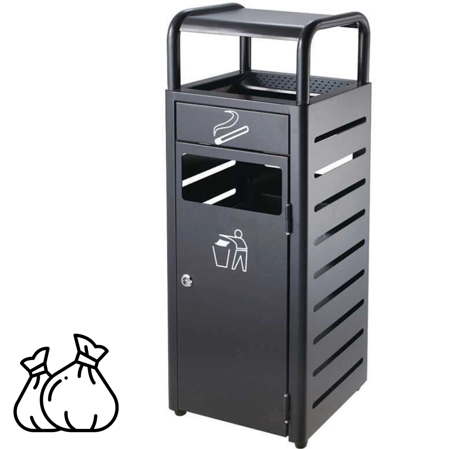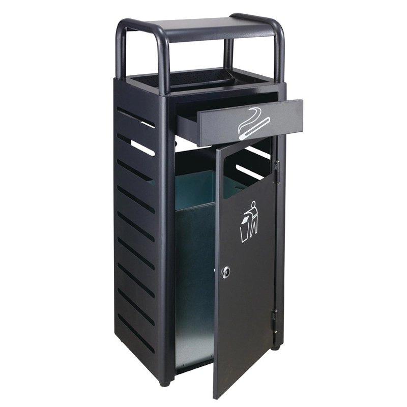 Ez a hamutartóval kombinált szemetes a funkcionalitást és az esztétikát ötvözi. Magas minőségű, ezüstszínű felületű rozsdamentes acélból és fekete dizájnnal készül, így ellenáll a mindennapi igénybevételnek, és könnyen karbantartható. A felső részen praktikus mélyedés található a csikkek elhelyezésére, amely tisztán és biztonságosan tartja a környezetet.