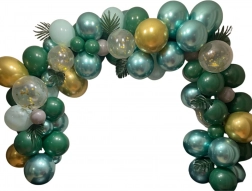 Alkoss otthon vagy az ünnepségen látványos dekorációt ezzel a nagy, zöld és arany tónusú lufifüzérrel. A szett vegyes méreteket, konfettis lufikat és trópusi leveleket tartalmaz a friss, dzsungel hangulathoz. A lufik levegővel vagy héliummal fújhatók fel, és lyukas rögzítős szalag segítségével könnyen gazdag, íves dekorációvá kapcsolhatók.