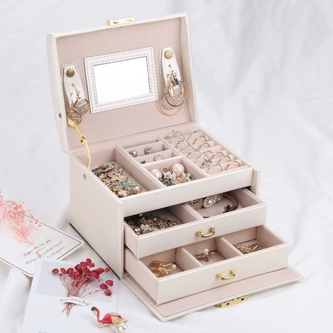 - Több szint és tároló: rekeszek, fiókok és akasztók különböző ékszertípusokhoz.