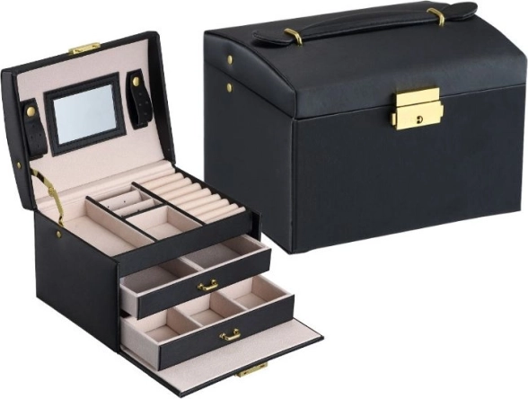 Elegáns, többszintes ékszerdoboz fekete színben, amely biztosítja, hogy ékszerei mindig áttekinthetően és biztonságban legyenek tárolva. A számos rekesznek, fióknak és akasztónak köszönhetően könnyedén rendszerezheti a fülbevalókat, karkötőket, láncokat és órákat. A puha, bársonyos bélés megóvja a karcolásoktól, a nagy, kivehető tükör pedig megkönnyíti az ékszerpróbát és a sminkelést. A modern dizájn jól mutat a fésülködőasztalon, komódon és a gardróbban is.