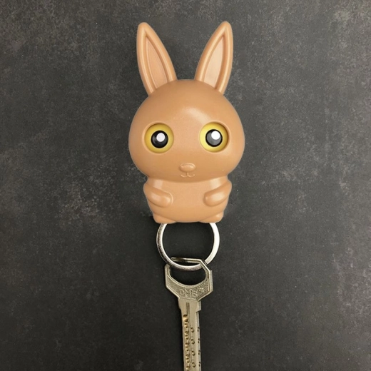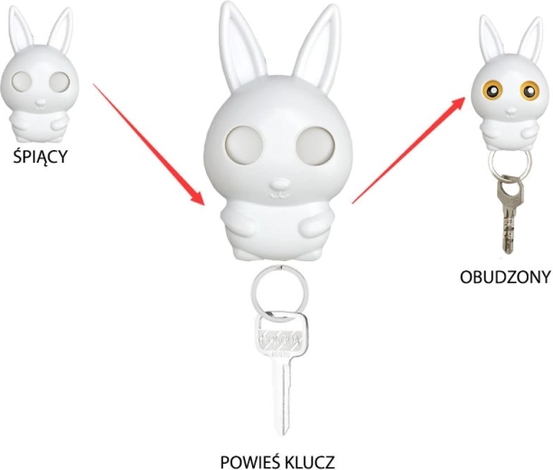 Falra szerelhető kulcstartó, ideális az előszobába, ahová hazaérkezés után felakaszthatja a kulcsait. Amint felakasztja a kulcsokat, a nyuszi „kinyitja a szemét”, így mindig szem előtt tarthatja őket. Ha a bejárat mellé szereli, többé nem felejti otthon a kulcsokat – a nyitott szemű nyuszi biztosan emlékeztetni fog rájuk.