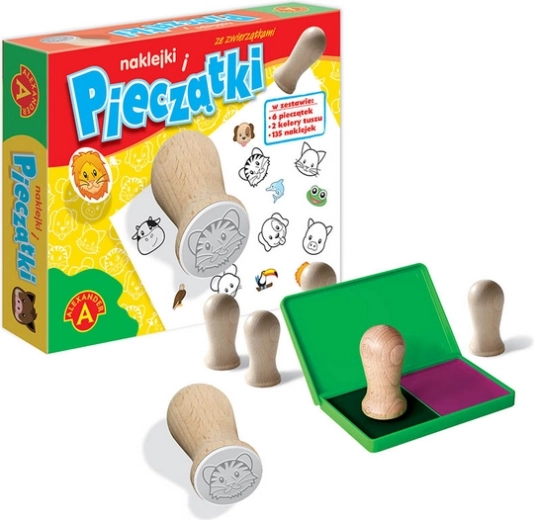 Kreatív készlet gyermekeknek, amely 6 állatmintás bélyeget tartalmaz (macska, kutya, egér, disznó, tigris, tehén), amelyek lenyomatai fekete és piros tintapárnával vihetők fel a kártyára a speciális műanyag dobozban található párnákkal. A lenyomott formák színezhetők ceruzákkal vagy tovább díszíthetők saját rajzokkal. A játékot 135 színes matrica dobja fel. Minden elem egy elegáns, funkcionális kis bőröndben található. 100% lengyel termék, kizárólag az Alexander gyárában készült.