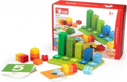 A nagy, tartós kockák kellemes fogásúak és biztonságosak az óvodások számára. A tanulás játékos formában zajlik – a gyerekek számok szerint építenek tornyokat, színek szerint válogatnak és gyakorolják a szem–kéz koordinációt.