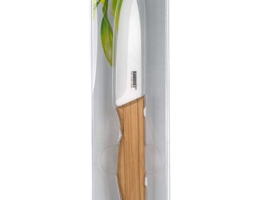 Fedezze fel a BANQUET Acura Bamboo kerámia kés kényelmét és pontosságát. A kemény cirkónium-oxid penge sokáig megőrzi az élességét, a kés mégis rendkívül könnyű és kiválóan kiegyensúlyozott. A bambusz nyél csúszásmentes TPR réteggel biztos fogást és kényelmet nyújt a mindennapi szeletelés során.