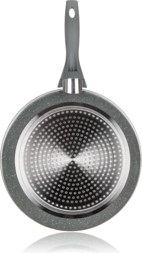 Ez az öntött-kovácsolt alumínium serpenyő szürke gránit dekorral a kiemelkedő tapadásmentességet ötvözi a magas tartóssággal. Minőségi magja kiválóan vezeti a hőt, felgyorsítja az ételek elkészítését és segít energiát megtakarítani. A felület kemény, karcálló és könnyen tisztítható.
