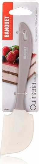 A Banquet márka szilikon spatulája nélkülözhetetlen segítő a sütés és főzés során. Ideális krémek kapargatásához és keveréséhez, mázak felviteléhez és torták dekorálásához. Tartós szilikonból készült, és műanyag nyéllel van kiegészítve, amelyen függesztő nyílás található.