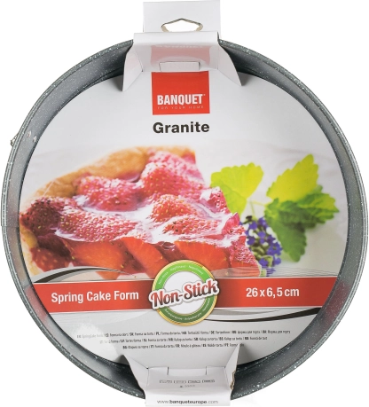 Gránit bevonatú tortaforma 26 cm átmérővel, 6,5 cm magassággal, 0,4 mm falvastagsággal. A tapadásmentes felületű tepsik és formák nélkülözhetetlen segítők minden konyhában. A XYNFLON tapadásmentes bevonat PTFE (politetrafluoretilén) alapú, nagyon tartós, kiváló tapadásmentes tulajdonságokkal rendelkezik, és könnyen tisztítható.