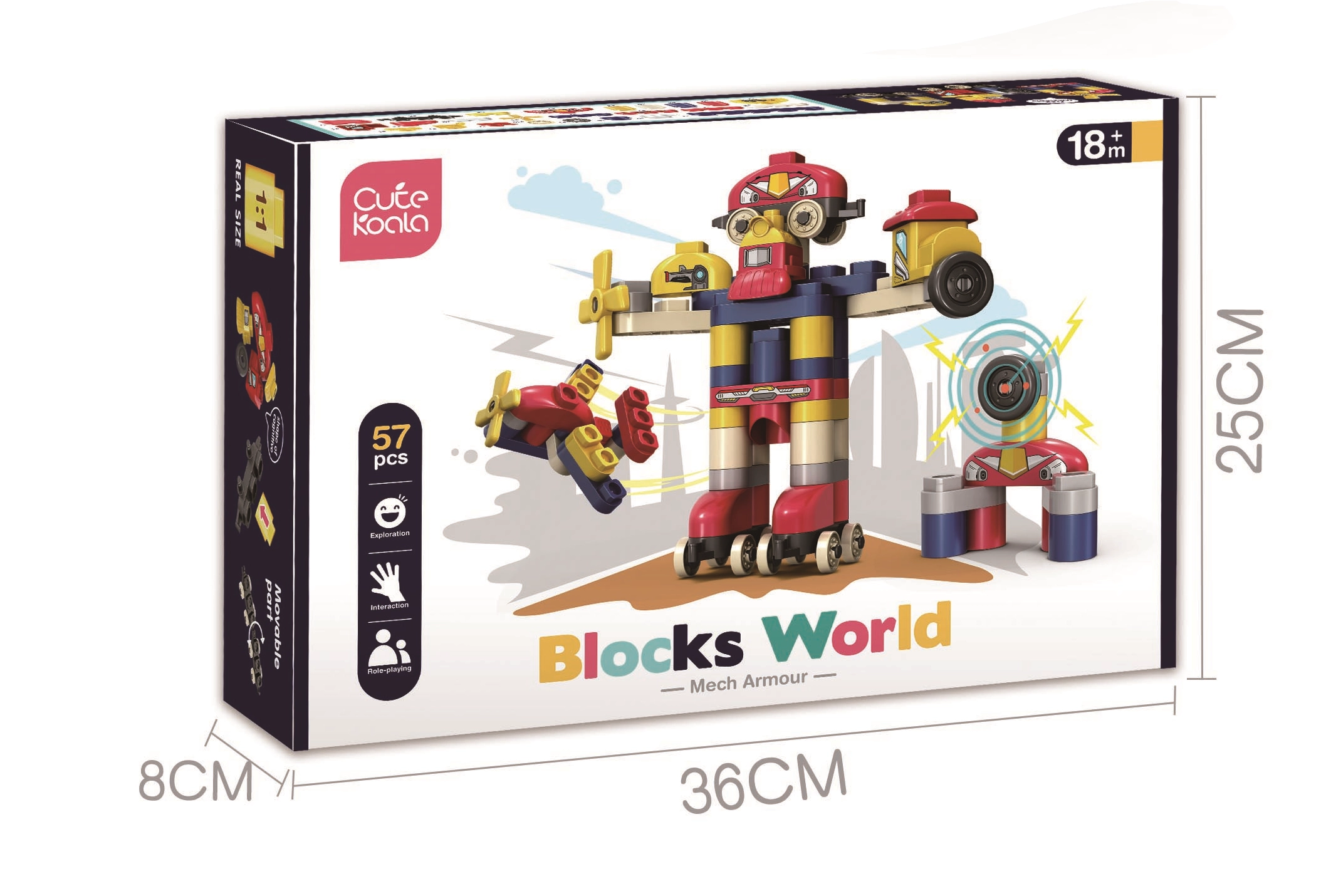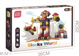 DUPLO stílusú kockák, amelyekből robotot, repülőt építhet. A kockákra ragasztott képeknek köszönhetően a gyermek tanulhat is játék közben.
