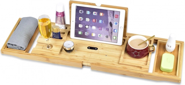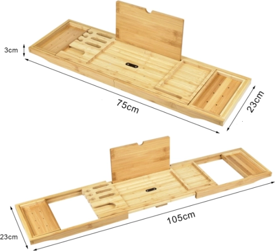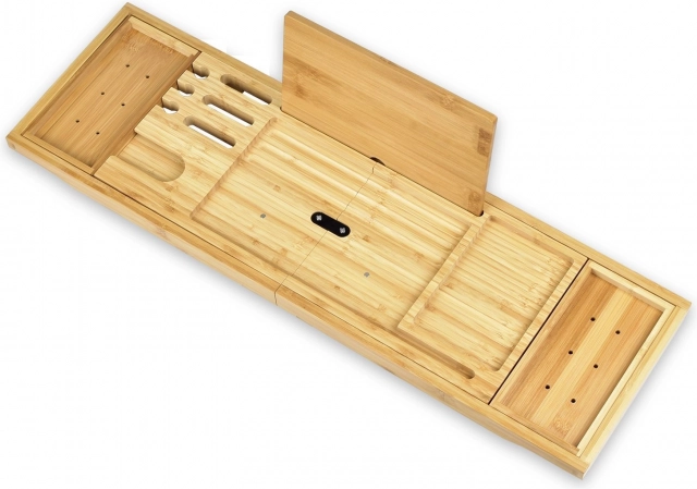 Tökéletes megoldás a fürdőszobai Spa hangulat megteremtésére. A bambusz fürdőkád polc úgy lett tervezve, hogy különböző méretű és alakú kádakra illeszkedjen. Azonnal használatra kész, szerelést nem igényel. Részét képezi még egy tablethez való nyílás és egy speciális bortartó is, ami lehetővé teszi a teljes relaxációt fürdés közben.