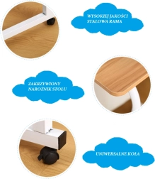 Az asztal egy speciálisan tervezett vázon helyezkedik el, amely kényelmes használatot tesz lehetővé akár ágyban is. A talpon lévő négy görgő gyors és biztonságos áthelyezést biztosít. Ha a görgőket rögzíteni szeretné, elég a féket benyomni. A lábtámaszok nagyon gyorsan kivehetők. Az asztal ideális nappaliba, hálószobába vagy konyhába. Nagy előnye az állítható magasság, így igényeihez igazíthatja. Az asztal magassága 70–90 cm között állítható. További előnye az univerzális és nagyon stílusos színváltozat.