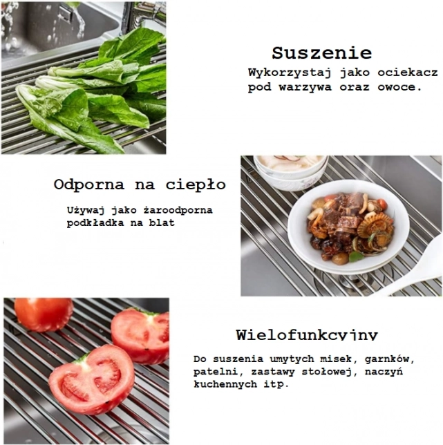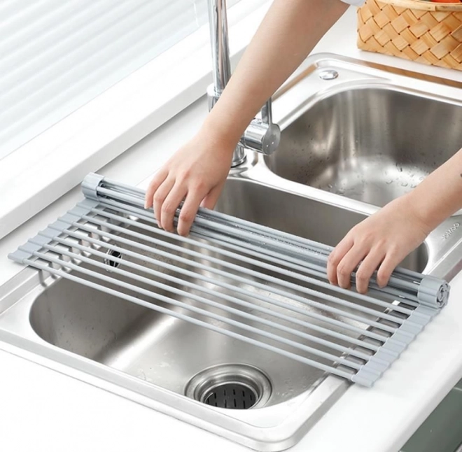 A feltekerhető csepegtető alátét nagyon hasznos segítő a konyhában. Úgy tervezték, hogy könnyen feltekerhető legyen és minimális helyet foglaljon el, ha éppen nem használják. Segítségével könnyen átöblíthető a gyümölcs és zöldség vagy megszárítható az edény, amikor a víz közvetlenül a mosogatóba folyik és az edények gyorsan megszáradnak. Egyszerű karbantartás bonyodalmak nélkül - csak öblítse le és hagyja megszáradni. Modern és hagyományos konyhákhoz egyaránt alkalmas.