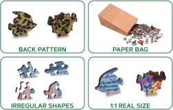 A csomag tartalmaz külön álló mintát, amely megkönnyíti a kirakást, és minden környezetbarát papírdobozban van tárolva. A puzzle 3-4 mm vastag kemény merevlemezből készült.