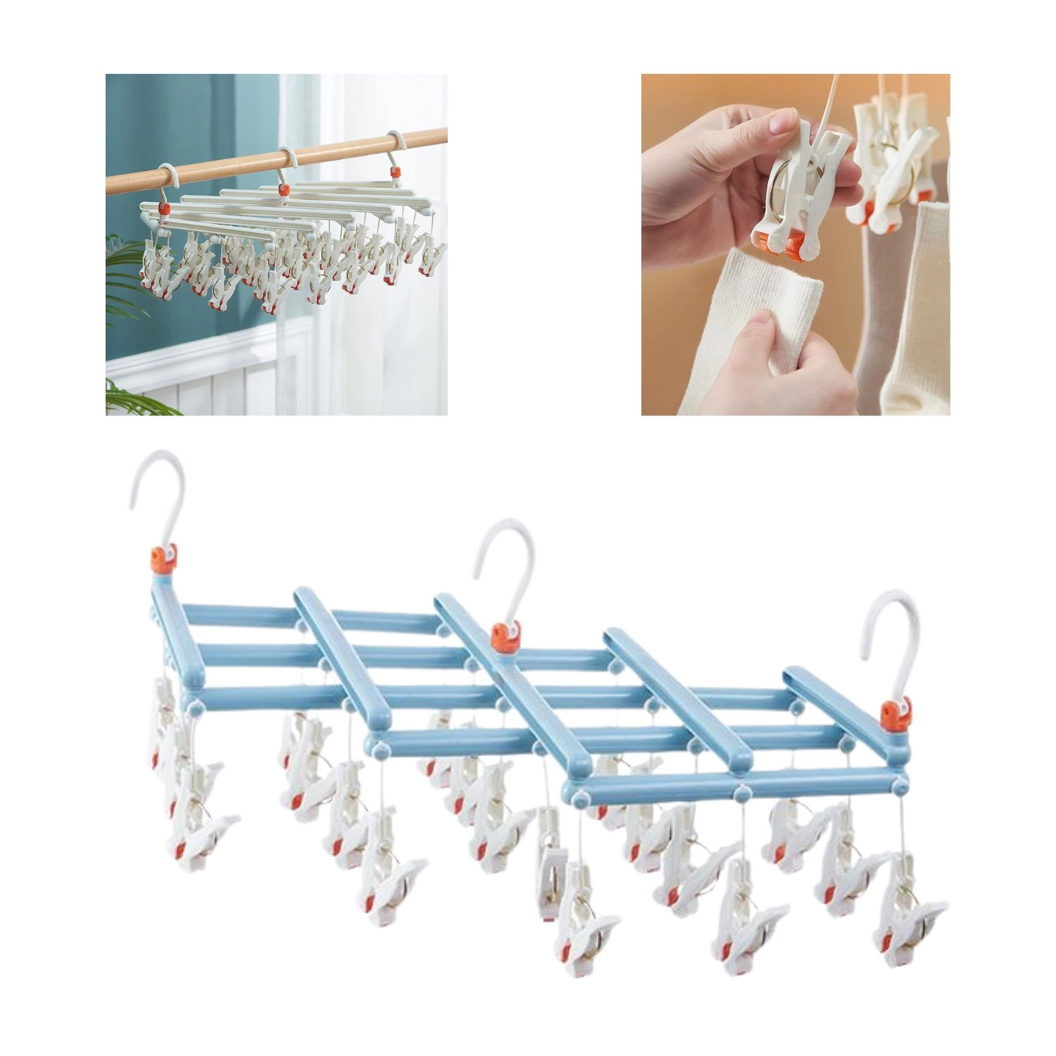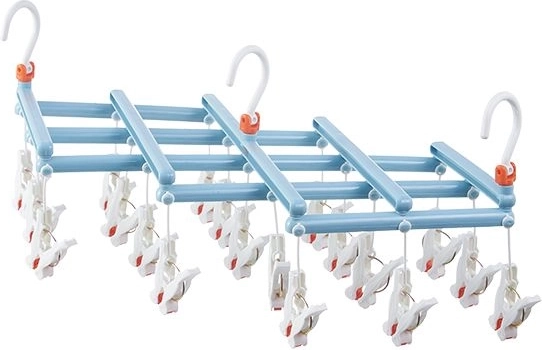 Praktikus, 19 csipesszel ellátott összecsukható ruhaszárító, ideális zoknik, fehérnemű és kisebb ruhadarabok szárításához. Könnyű, mégis tartós műanyag konstrukció, forgó kampó az egyszerű felakasztáshoz és helytakarékos összecsukás – megbízható segítő otthon, erkélyen és utazás közben is.