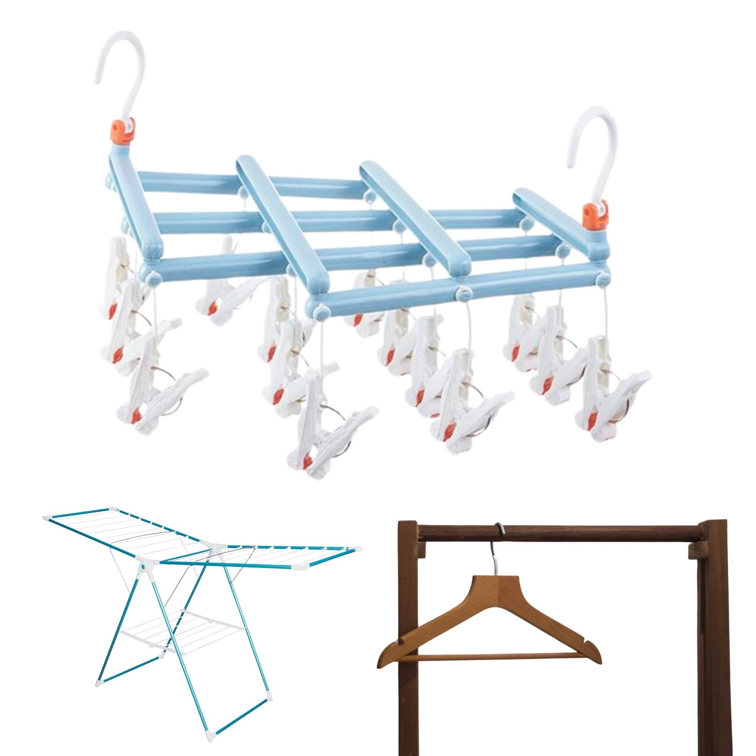 A reteszelhető, forgatható akasztónak köszönhetően felakasztható rúdra, kötélre, erkélyre vagy klasszikus ruhaszárítóra. Az összecsukható szerkezet helyet takarít meg tároláskor és szállításkor – tökéletes lakásba, nyaralóba és kempinghez.