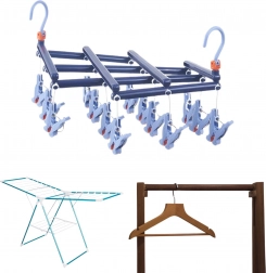 Fedezze fel a mindennapi apró ruhanemű szárításának megbízható megoldását. A 14 erős klipszes, összecsukható szárító minőségi, nedvességálló műanyagból készült, így bátran használható beltéren és kültéren is. A zárható, forgó akasztó stabil felakasztást biztosít bárhol – erkélykorláton, szárítón, szekrényrúdon vagy kempingkötélen.