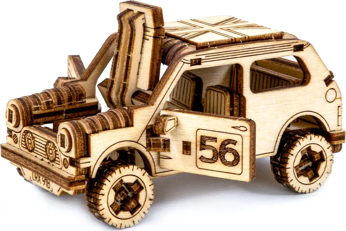 Az összeállított jármű rétegezett fa kerekei forognak, így a modell nemcsak dekoráció, hanem működő játék is.