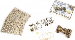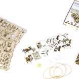 Lézerrel kivágott nyírfurnér elemek pontos illeszkedéssel. A sima működéshez elegendő az utasítás szerint viaszolni a tengelyeket és fogaskerekeket.