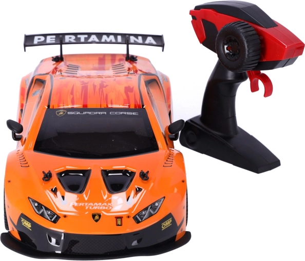 Valósítsd meg versenyálmaidat a licencelt LAMBORGHINI HURACÁN GT3 1:12 méretarányú modelljével. A 2,4 GHz technológiának köszönhetően az irányítás egyenletes és zavarásmentes, az autó előre/hátra és balra/jobbra halad, 12–15 km/h sebességet ér el, a hatótáv pedig akár 40 m. Ideális ajándék 6 éves kortól és kezdő RC rajongóknak is.
