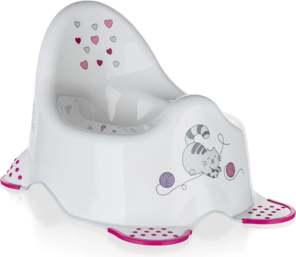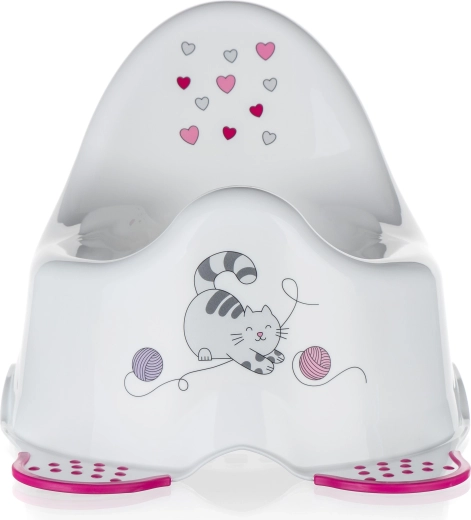 Tegye a bilin való gyakorlást kellemes és biztonságos élménnyé. Ez a fehér színű, aranyos cicamintás bili ergonomikus üléssel és magas háttámlával tűnik ki, ami biztonságot és kényelmet nyújt a gyermeknek. Az alján található csúszásgátló elemek stabilan a helyén tartják a bilit.