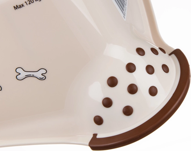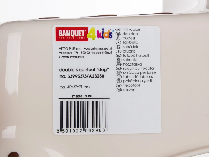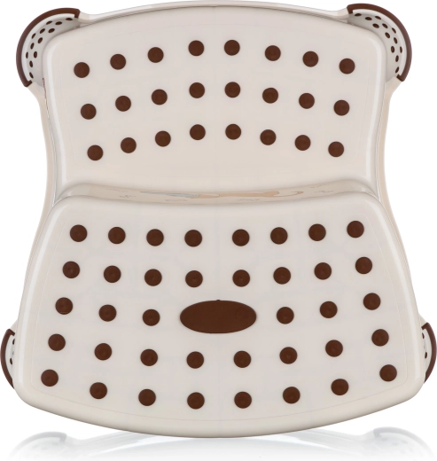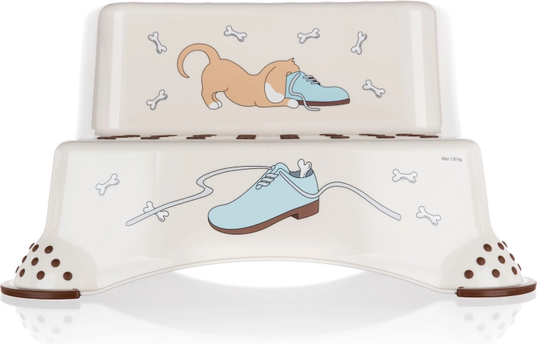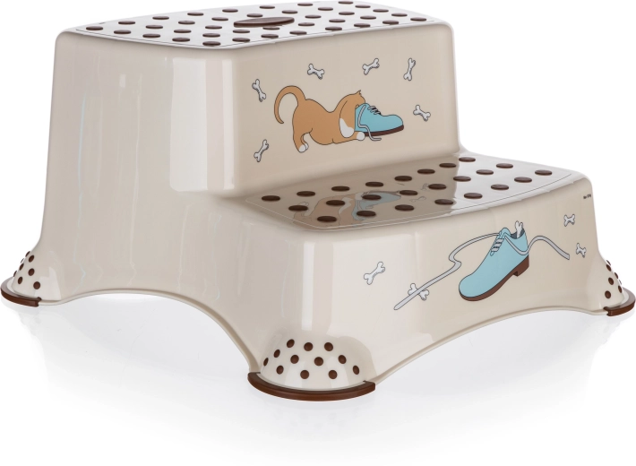 A bézs, kétszintes fellépő vidám DOG mintával ideális segédeszköz a gyerekszobába, fürdőszobába vagy konyhába. A lépcsőfokokon lévő csúszásgátló kiemelkedések és az alsó rész csúszásgátló tappancsai biztos lépést nyújtanak nedves és száraz felületen egyaránt. Kompakt, 40,5 × 37 × 21 cm-es méreteinek köszönhetően könnyen hordozható és tárolható.
