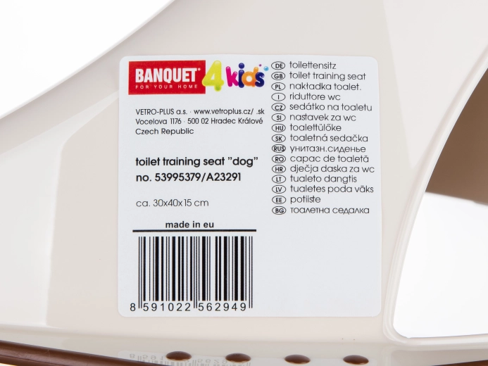 A BANQUET DOG gyermek WC szűkítő ideális segédeszköz azoknak a gyerekeknek, akik a bili használatáról a hagyományos vécére váltanak. A klasszikus ülőke kicsinyített változata kényelmes és biztos ülést nyújt, míg a körben elhelyezett csúszásgátló elemek megakadályozzák az ülőke elmozdulását és a nem kívánt megcsúszást.