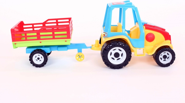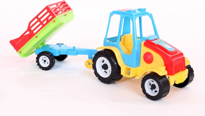 Gyerek traktor pótkocsival, amely szórakoztató játékot kínál otthon és a szabadban. A pótkocsi egytengelyes, forgatható, és hátrafelé billenthető a könnyű kirakodás érdekében. A játék biztonságos, nehézfémtől mentes anyagokból készült, és megfelel minden biztonsági követelménynek. A játék méretei: hossz 48 cm, szélesség 15 cm, magasság 17,5 cm.