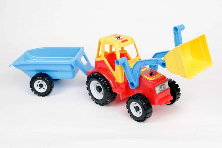 Színes műanyag traktor első rakodóval és billenő pótkocsival, amely órákon át tartó szórakozást nyújt otthon és a szabadban. A működő kanálnak és a pótkocsi könnyű kiürítésének köszönhetően a gyerekek fejlesztik finommotorikájukat és képzelőerejüket. A játékot valósághű lámpamatricák díszítik, anyaga biztonságos, nehézfémektől mentes. Működő rakodó, billenthető kétkerekű pótkocsi, strapabíró műanyag, biztonságos anyagok.