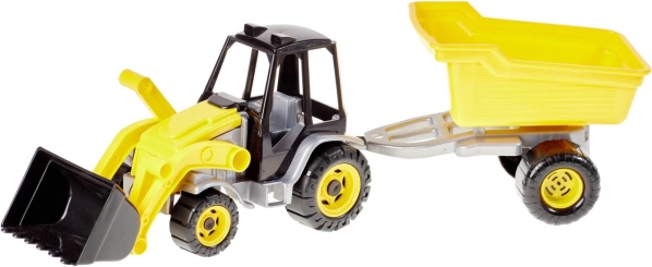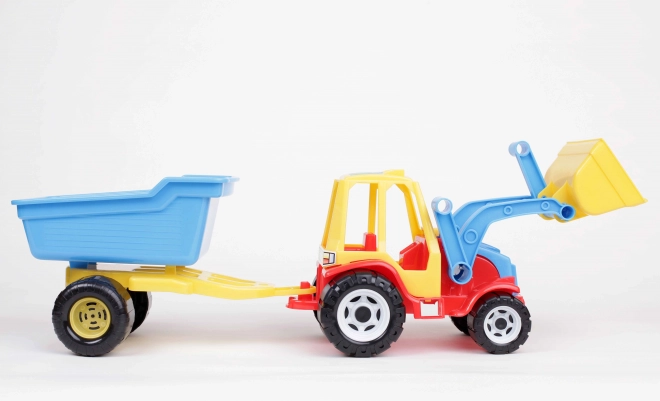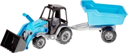 Traktor elöl széles, mozgatható rakodóval és hátul lekapcsolható pótkocsival. A hátrafelé billenthető kék pótkocsi egytengelyes alvázra van szerelve. A készlet mozgó elemeket tartalmaz, amelyek még élvezetesebbé teszik gyermeked játékát és pozitívan hatnak a fejlődésére.