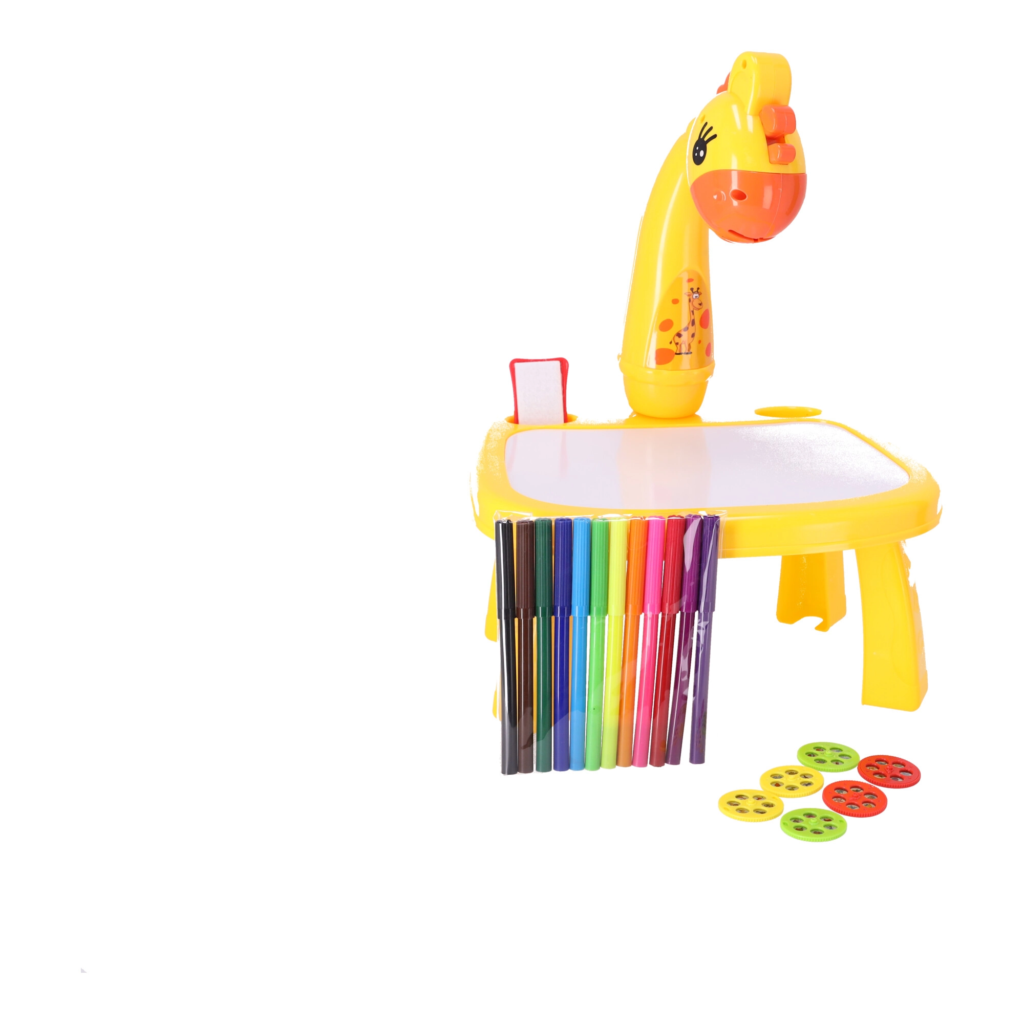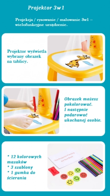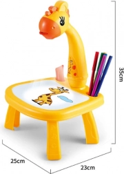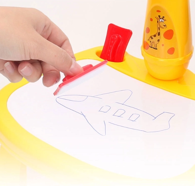 Ez a gyerek rajzvetítő közvetlenül a rajzfelületre vetíti a képeket, így a gyermek kiválasztja a motívumot, átrajzolja, majd kiszínezi. A tanulás játékos formában történik – a gyerekek gyakorolják a ceruzafogást, a vonalvezetést és a színek felismerését. A zsiráf fejével ellátott stabil asztalka könnyű és hordozható, így otthon és útközben is remekül használható.