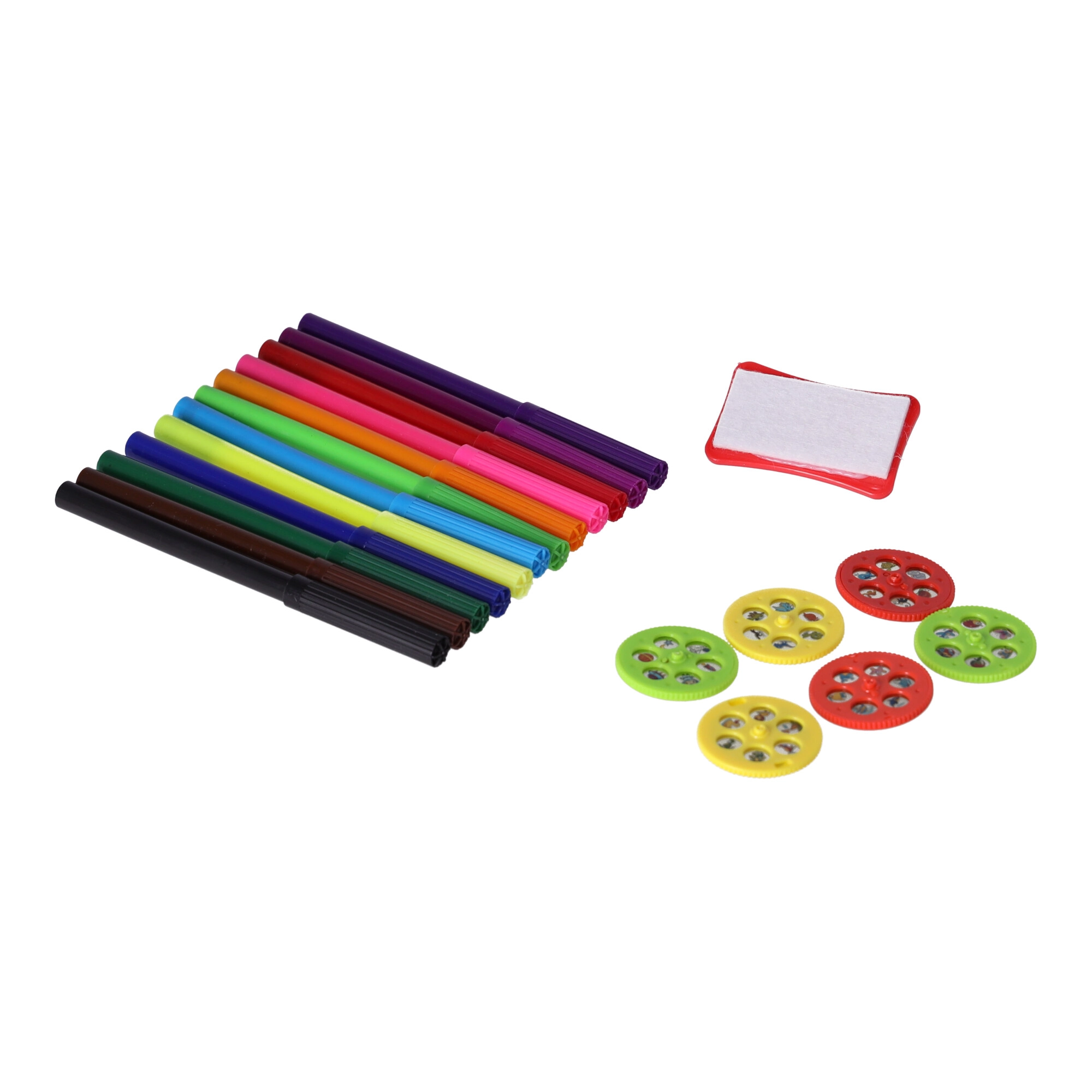 A csomagban 6 sablontárcsa, 12 színes filc, papír és radír található. A gyerekek azonnal alkothatnak kibontás után.