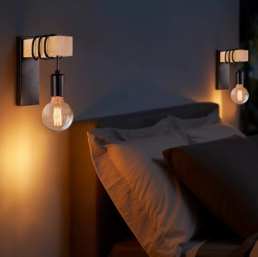 Ez a fali lámpa modern, ipari megjelenést visz bármely térbe a fekete és a fa kombinációjával.