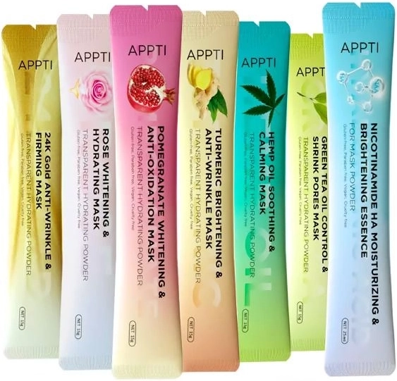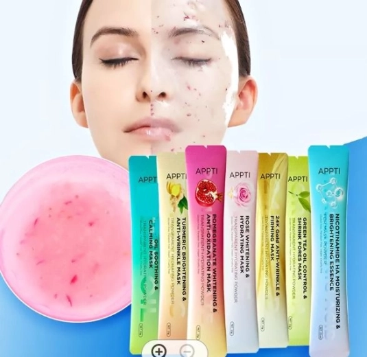 Rózsaszín arcmaszk tasakban, amely elsősorban hidratálást biztosít. Ideális minden bőrtípusra. A tasak tartalma a megfelelő mennyiségű vízzel elkeverve géllé alakul. A tasak mennyisége teljes mértékben elegendő az egész arc lefedésére.
