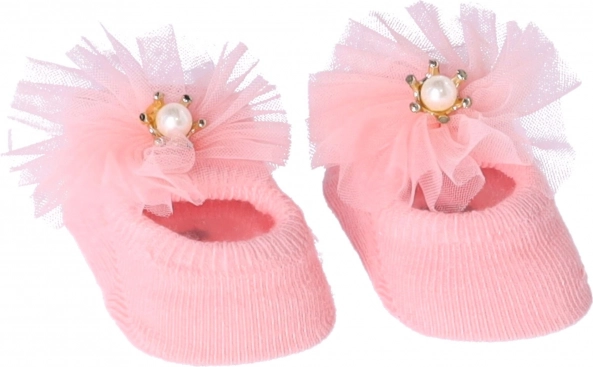 Rózsaszín cipőcskék tüll masnival és gyöngyökkel díszítve, ideális különleges alkalmakra.