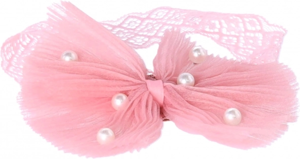 Rózsaszín csipkéből készült fejpánt dekoratív tüll masnival és gyöngyökkel. Ideális a gyermek frizurájának kiemelésére.