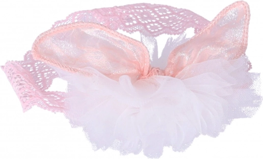 Rózsaszín csipkéből készült fejpánt fehér tüll pompommal és rózsaszín textilfülekkel. Remek választás fotózáshoz és különleges eseményekhez.