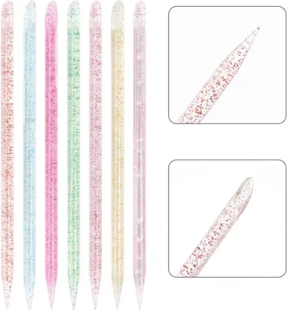 Újrahasználható manikűr pálcikák BLING elengedhetetlen elemei minden körömápolásnak. Az egyik oldal spatula alakú, ami a bőr visszatolására szolgál, míg a kúpos vég a körmök körüli szennyeződések tisztítására alkalmas a stílus kialakítása során.