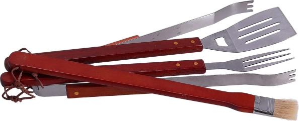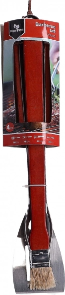 A 4 részes grillező szerszámkészlet tartalmaz egy kefét, fogót, lapátot és villát rozsdamentes acélból. A készlet a grillezéshez szükséges alapvető eszközöket tartalmazza. A szerszámok akasztófüllel vannak ellátva.
