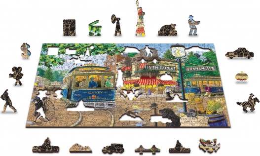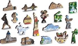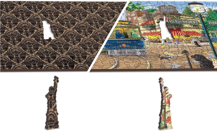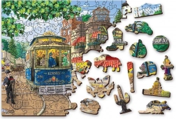 - A WOODEN CITY lézervágott fából készült, egyedi kirakója különleges alakú elemeket tartalmaz, állatok, épületek vagy tárgyak formájában.