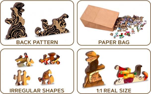 A különböző alakú kirakódarabokból álló puzzle összerakása nehezebb, és nagyobb kihívást jelent, mint a klasszikus puzzle. A puzzle ráadásul kétoldalas, így rakhatja a képes oldal (előlap) szerint, vagy a forma alapján (hátoldal mintával). A WOODEN CITY márka az egyedi puzzle-koncepció mellett az ökológiára is figyel, ezért ezeknél a termékeknél nem talál műanyag csomagolást. Egyedien formázott darabokkal, amelyek a témának megfelelően ismert épületeket, tárgyakat vagy állatokat ábrázolnak. Magasabb nehézségi szint kevesebb darabszám mellett – a különböző formájú darabokkal való kirakás igényesebb.