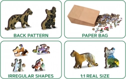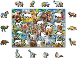 A WOODEN CITY fa puzzle „Állatos képeslap” motívummal egyedülálló kirakóélményt nyújt. A kétoldalas kivitelnek köszönhetően választhat a színes kép szerinti kirakás és a hátoldali ismétlődő minták formái szerinti kirakás között. A lézerrel kiemelt részletek látványossá teszik az egyes darabokat, és néhányuk – állatok, épületek vagy tárgyak formájában – önállóan is megáll, mint kis figurák.