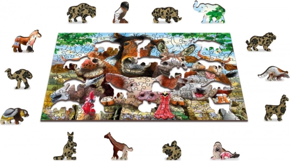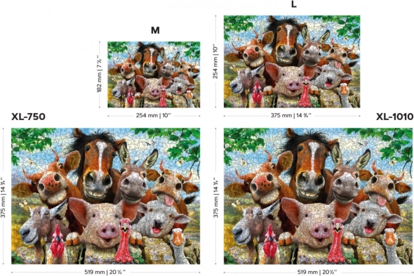 Az „élet a farmon” témájú fa kirakó egyedülálló élményt nyújt egy vidám állatokkal teli, színes kép összeállításával. A precíz lézervágásnak köszönhetően az egyes, 3–4 mm vastag elemek illesztése gördülékeny és szórakoztató, némelyik elem pedig önálló figurális alakot formáz. A kétoldalas nyomat lehetővé teszi a kép szerinti és a hátoldali minták szerinti kirakást is.