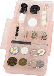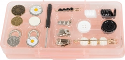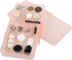 A készlet különböző méretű tűket, cérnákat és gombokat tartalmaz, ami lehetővé teszi a sokféle javítást.