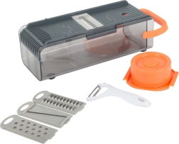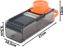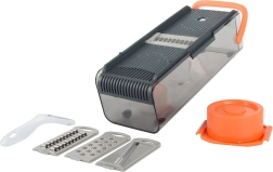 A multifunkcionális szeletelő és reszelő úgy lett tervezve, hogy megkönnyítse a mindennapi főzést. Négy cserélhető tartozékkal érkezik, amelyek a konyhai szükségleteihez igazodnak. Az átlátszó tároló fedéllel lehetővé teszi az összetevők hűtőben való könnyű tárolását anélkül, hogy elveszítené frissességüket.