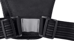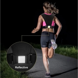 Az ergonomikus szabás állítható pántokkal különböző testalkatokhoz igazodik, a neoprén habból készült puha anyag kellemes a bőrön és jól tart. A fényvisszaverő elemek növelik a biztonságot szürkületben, a két kisebb zseb a vállrészen pedig ideális kulcsok, kártyák vagy bankjegyek számára.