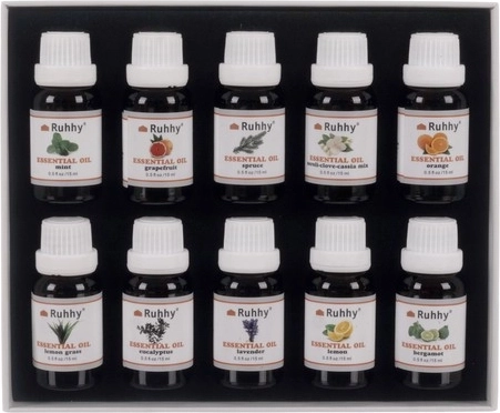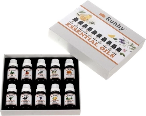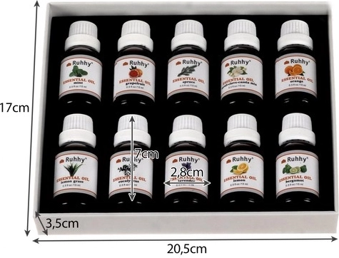 A teljes szett 10 különböző illatot tartalmaz, mint például eukaliptusz, narancs, menta, levendula és mások. Minden üveg tartalma 15 ml.