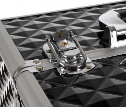 A fekete és ezüst fém kombinációja geometrikus mintákkal modern megjelenést biztosít a bőröndnek, miközben garantálja annak tartósságát.