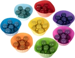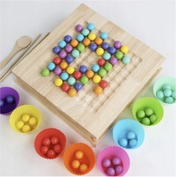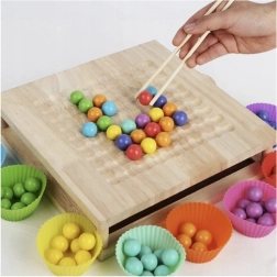 A golyók csipesszel, pálcikákkal és kanállal való mozgatása támogatja a helyes fogást, a mozdulatok pontosságát és a koncentrációt – ideális, játékos, montessori jellegű tanulás.