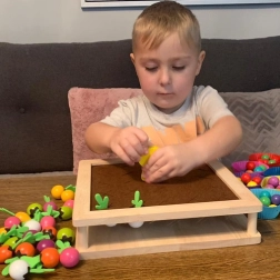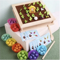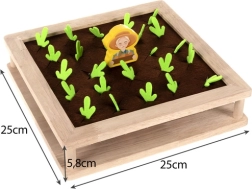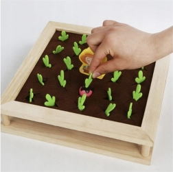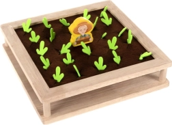 Ez a fa oktatójáték 2 az 1-ben ötvözi a szabad játékot a tanulással. A gyerekek „ültethetik” és betakaríthatják a filc zöldségdarabokat a kertben, színek szerint válogathatják és számolhatják a gyöngyöket a tálkákba, vagy memoryt játszhatnak tematikus kártyákkal. A masszív fa tábla kétoldalú – az egyik oldal a golyók behelyezésére és a fogás gyakorlására szolgál, a másik a farmos memória- és megfigyelőjátékot kínálja.