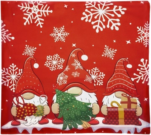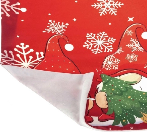 A piros alapon látható, feltűnő manóminta hópelyhekkel pillanatok alatt meleg, ünnepi atmoszférát kölcsönöz a térnek.