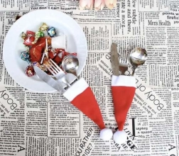 A klasszikus piros-fehér kombinációjú evőeszköz-sapkák ünnepi varázst kölcsönöznek a terítéknek, és elegánsan egyben tartják az evőeszközöket.